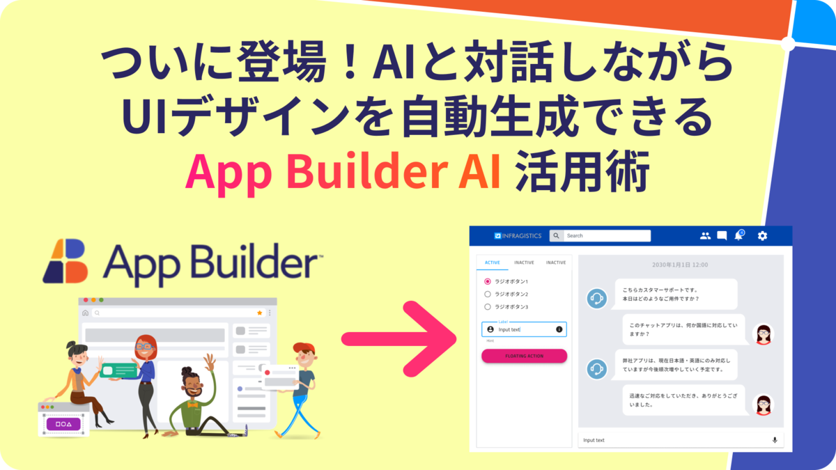 App Builder AI は、Infragistics が提供する法人向けBtoB業務アプリのUI作成に特化した対話式のAI機能です。App Builder AI の特徴は以下の通りです。