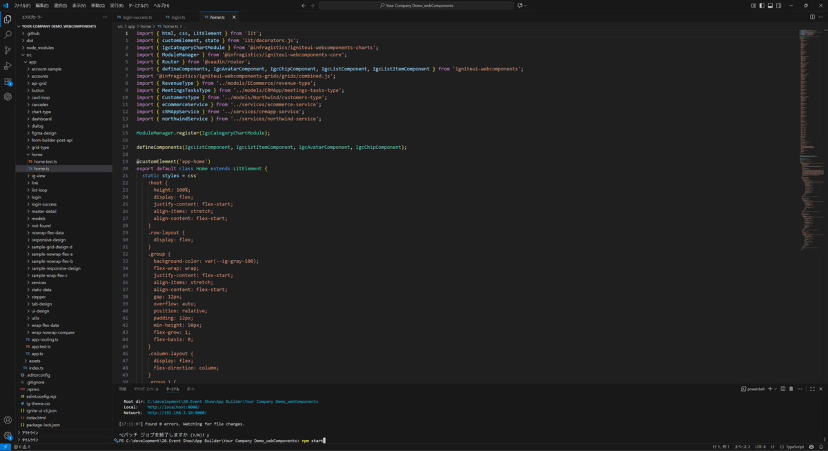 次に App Builder からコード自動生成したコードです。特徴的なのはBtoB業務レベルの、本番コードが設定ファイル、MVCを意識した設計(Model / Services / View に整理された構造化コード)としてファイル一式が生成されるところです。Web Components でコード出力する場合はネイティブの TypeScript で出力されます。