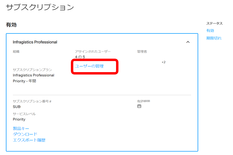 カスタマーポータルにログイン後、利用者変更をしたいサブスクリプションの「ユーザーの管理」をクリックしてください。
