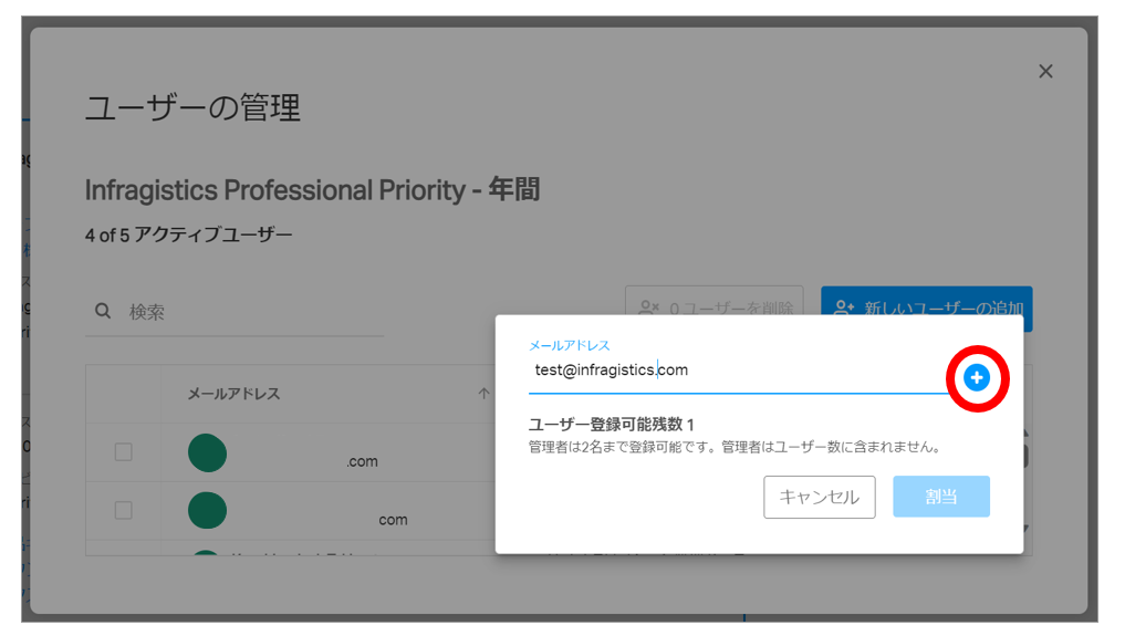 新しく追加したい利用者のメールアドレスを入力後、「+」をクリックしてください。