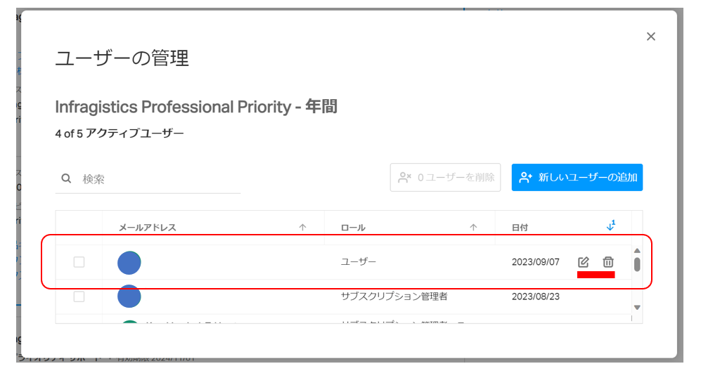 登録済の利用者にマウスをホバーすると右側に「変更」(鉛筆とノートのマーク)、「削除」(ゴミ箱のマーク)が表示されるので、そこから個別の変更、削除ができます。