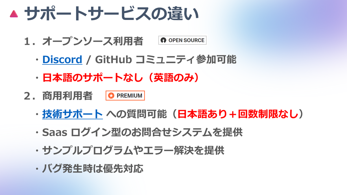 オープンソース版とプレミアム版ではサポート体制が異なります。特に「日本語サポートなし/あり」は日本市場のユーザーにとって、比較検討のポイントとなる場合が多く、高度なUIライブラリを使いこなすための外部リソースとして有効活用が検討されています。