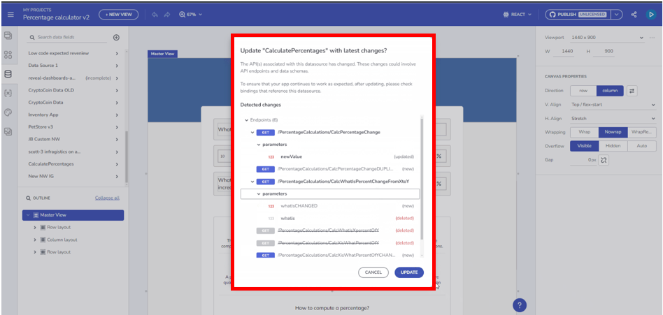 さらに、Reactコード生成に加え、Select、Text-area、Radio-group コンポーネントの双方向データバインディングのサポートが追加されました。これにより、ユーザーインターフェースとデータモデルの間でシームレスな同期が可能になります。また、アプリで使用されているデータソースの最新更新情報を通知する機能も追加され、データの変更を効果的に管理できるようになりました。